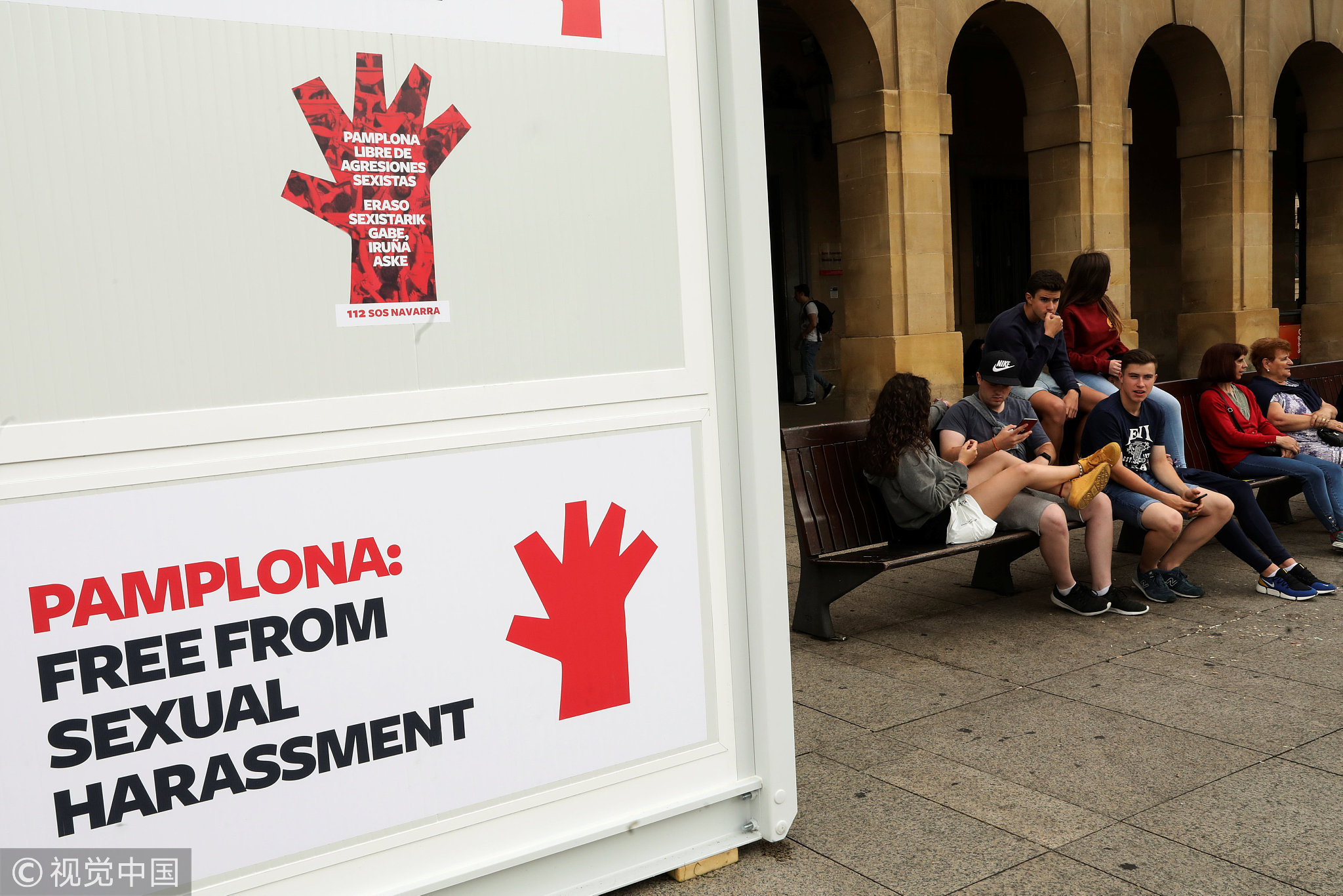 People sit near an information and helpline booth on sexual violence two days before the start of the annual San Fermin bull-running festival in Pamplona, Spain, July 4, 2018. /VCG Photo