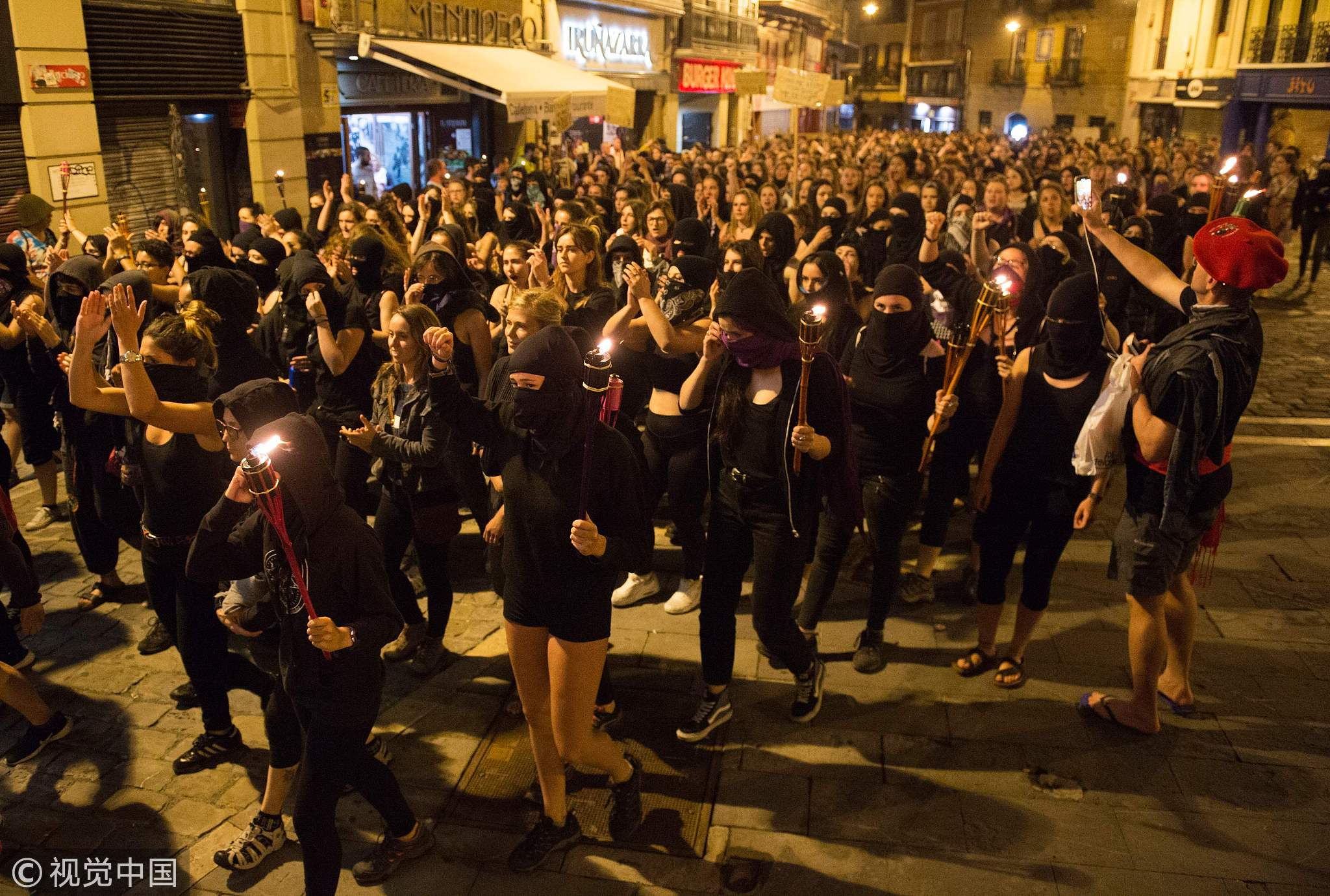 Women covering their faces with black scarves demonstrate in Pamplona before the start of the San Fermin Festival, July 4, 2018. /VCG Photo