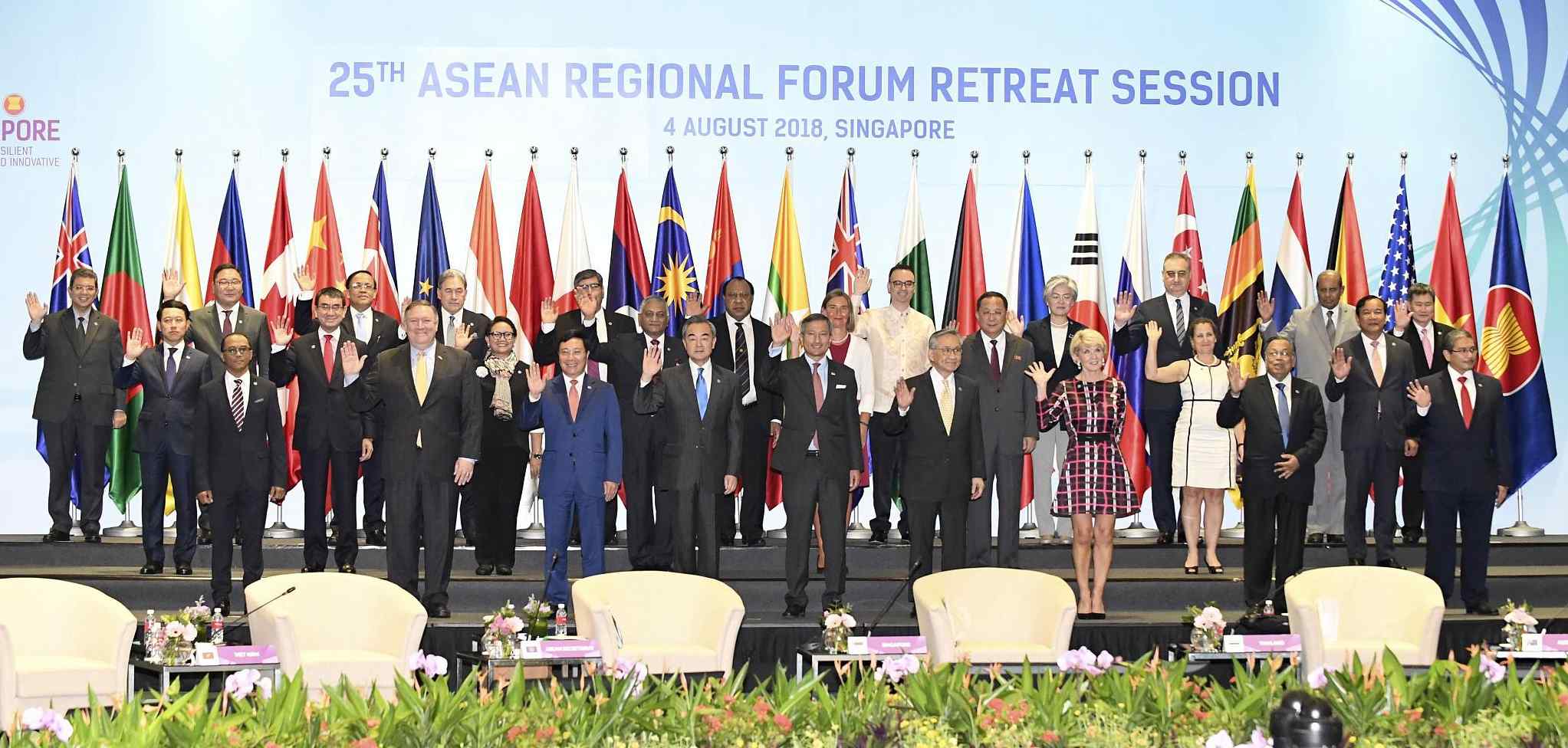 August 4, 2018: Asia-Pacific foreign ministers pose for photos at the ASEAN Regional Forum meeting in Singapore. /VCG Photo