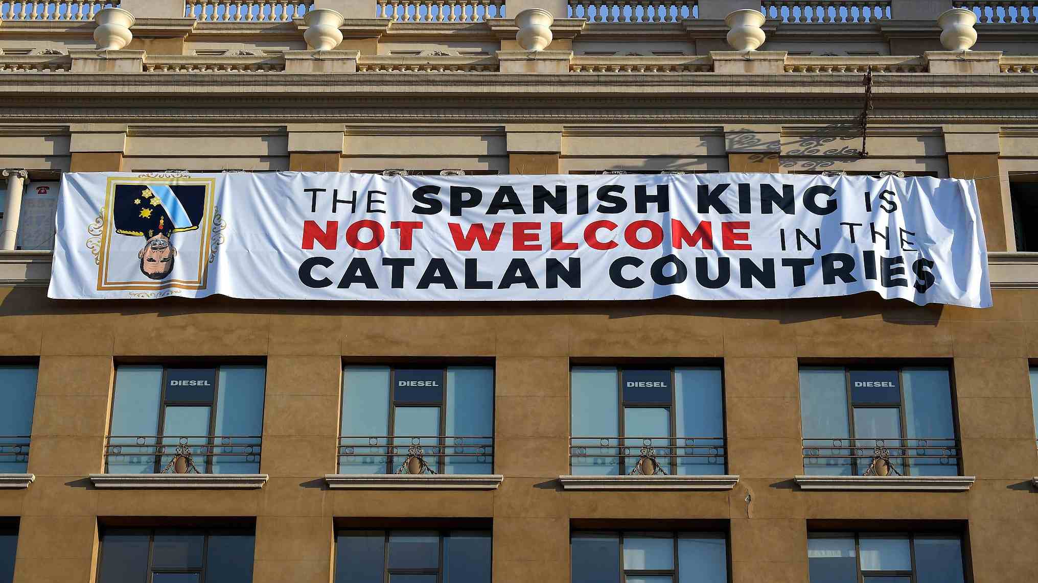 "The Spanish King is not welcome in the Catalan countries," the banner read in English. It was accompanied by an upside-down portrait of the monarch.