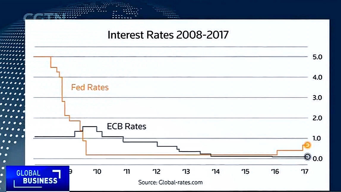 A screenshot showing ECB and Fed’s interest rates from 2008 to 2017. /CGTN Photo