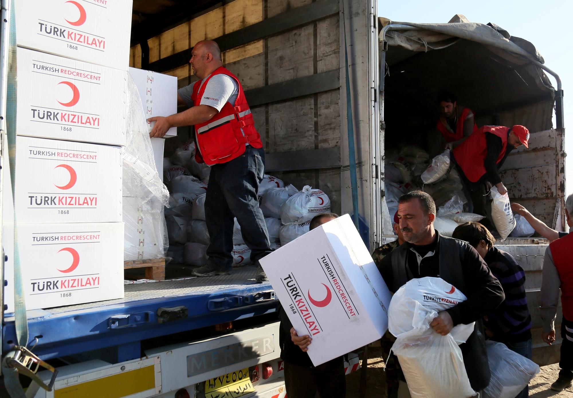 Internally displaced Iraqis fleeing fighting around the Iraqi city of Mosul receive aid from Turkish Red Crescent in Faziliye village of Bashiwa town in Iraq on Noveber 28, 2016. / CFP Photo‍