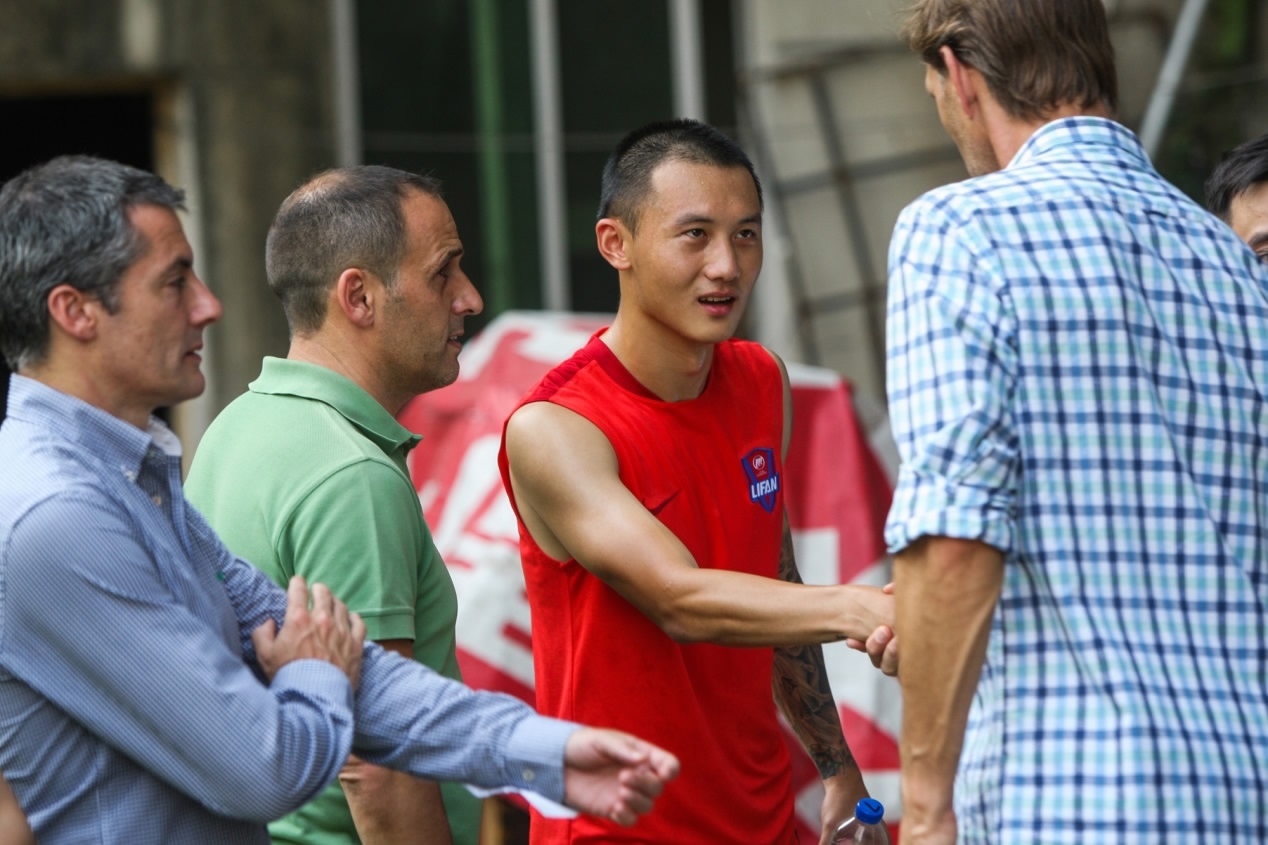 Adams greeted by the former Chongqing defender Yang Yun. /CFP Photo