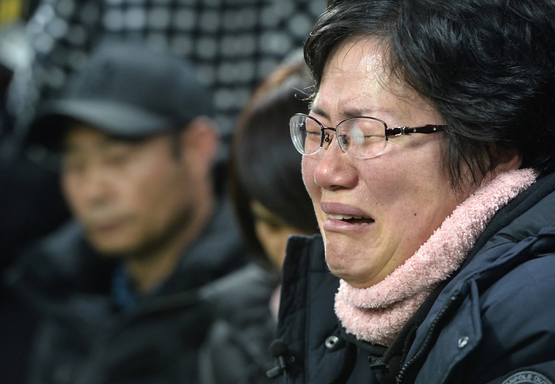 A family member of a missing passenger onboard sunken ferry Sewol cries during its salvage operations at the sea off Jindo, South Korea, March 23, 2017. /CFP Photo