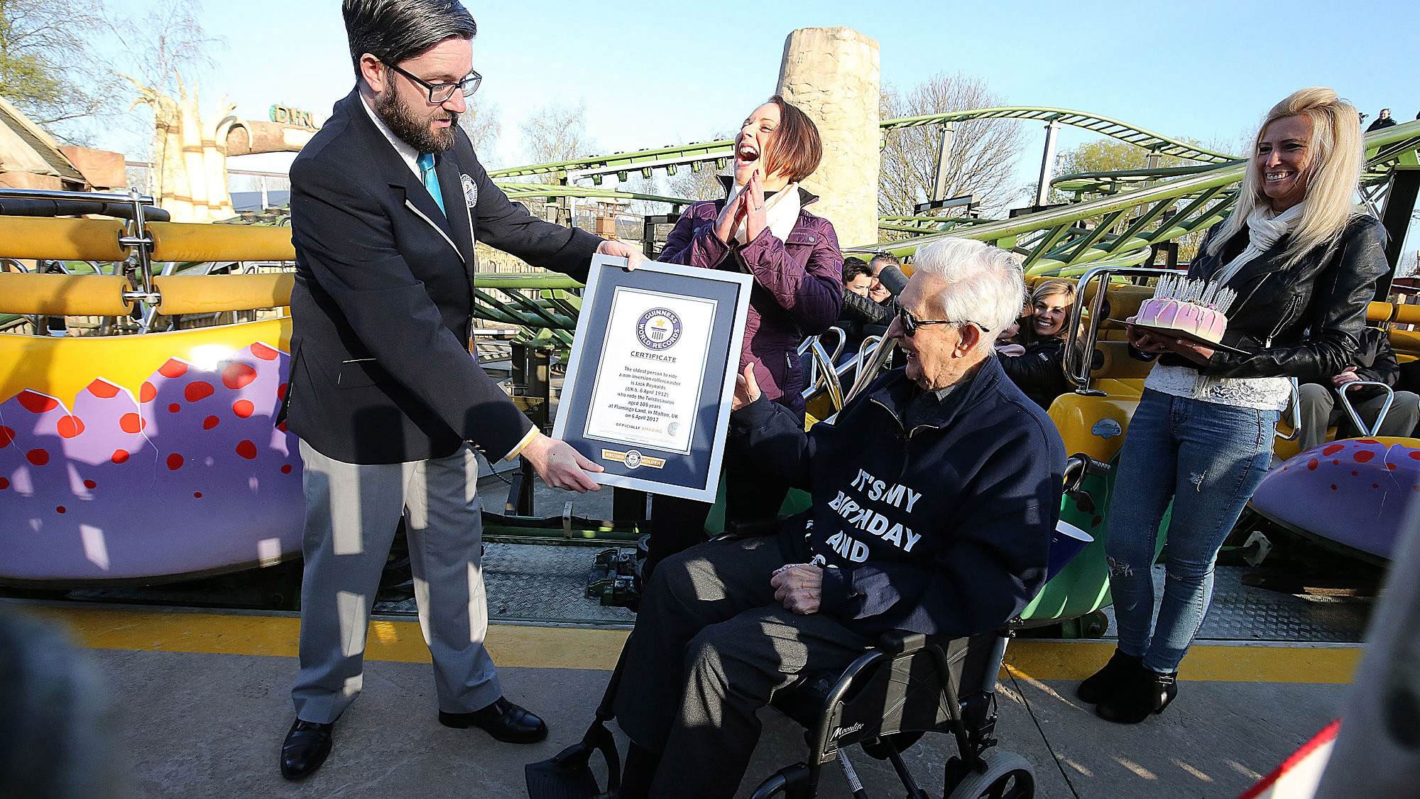A 105-year-old Englishman with a penchant for setting world records has become the oldest person to ride a rollercoaster.
