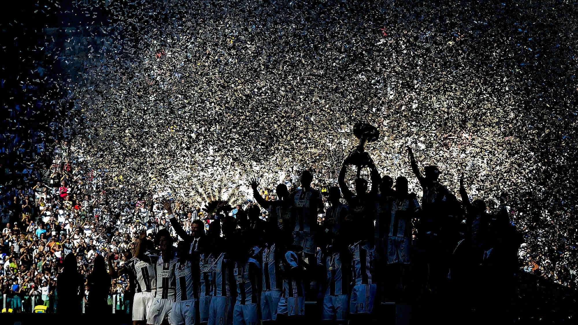 Juventus players celebrate the victory of the Italian Serie A 'Scudetto' at the end of the Serie A football match between Juventus FC and FC Crotone. /VCG Photo