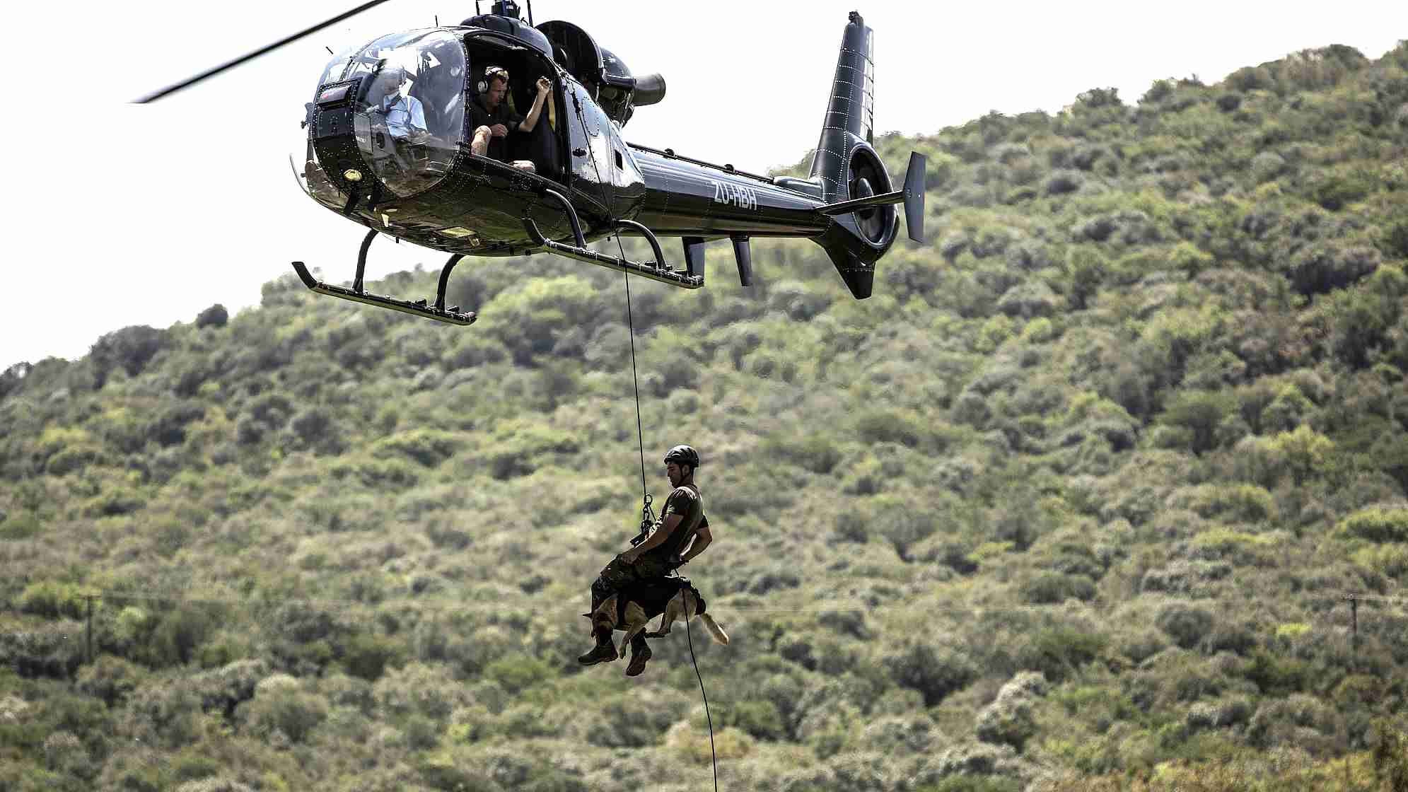 Former special forces Marius and his antipoaching dog Venom get ready to jump out from a moving helicopter on November 26, 2014 as they simulate the arrest of rhinoceros poachers with trainee dogs /CFP Photo