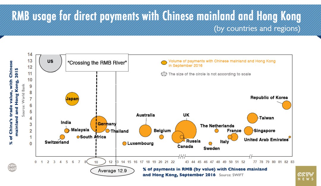 According to the report, seven new countries have “crossed the RMB river”, using RMB for over 10 percent of their direct payments with the Chinese mainland and Hong Kong, bringing the total to 57 countries worldwide in September 2016, up from 50 in October 2014.
