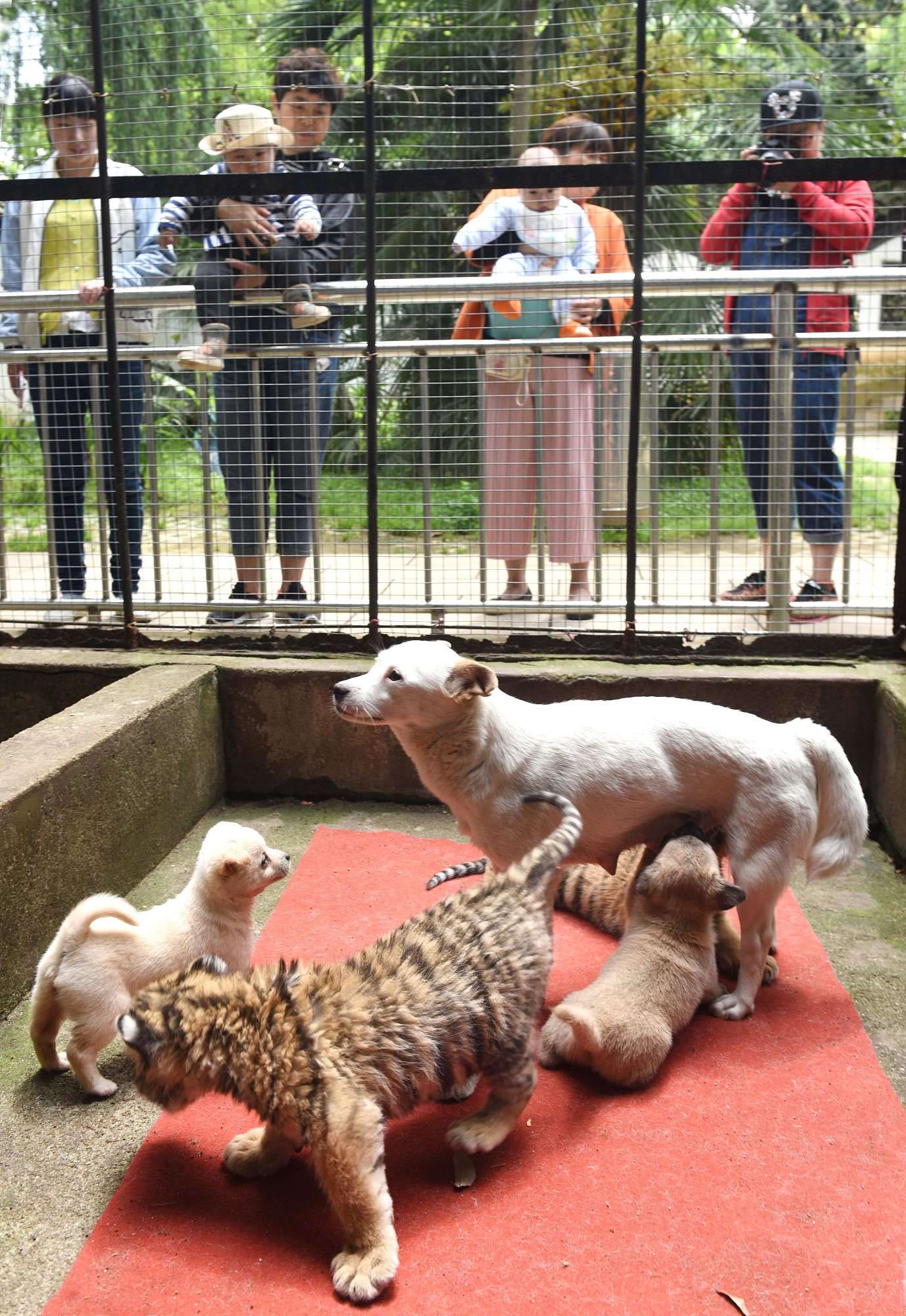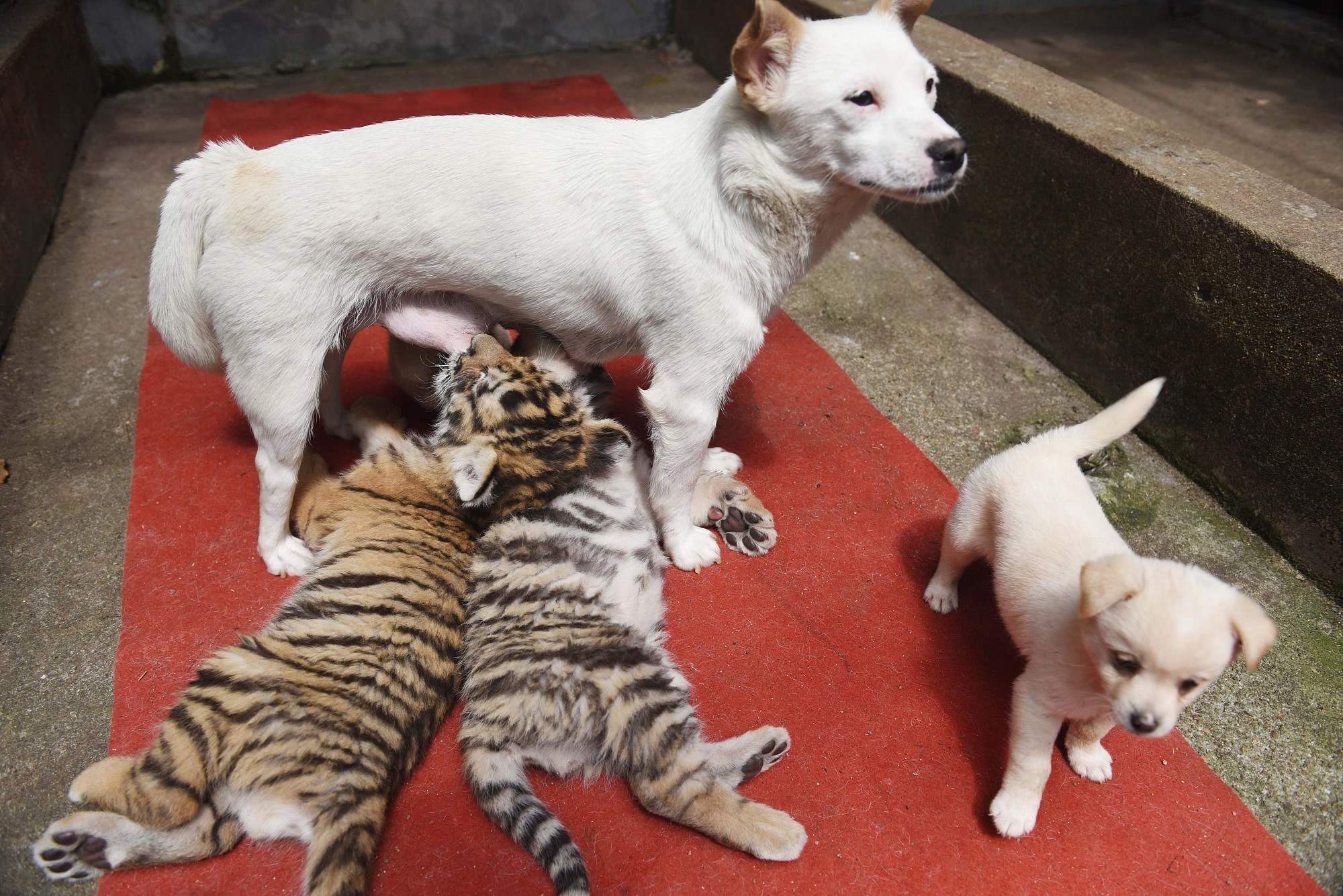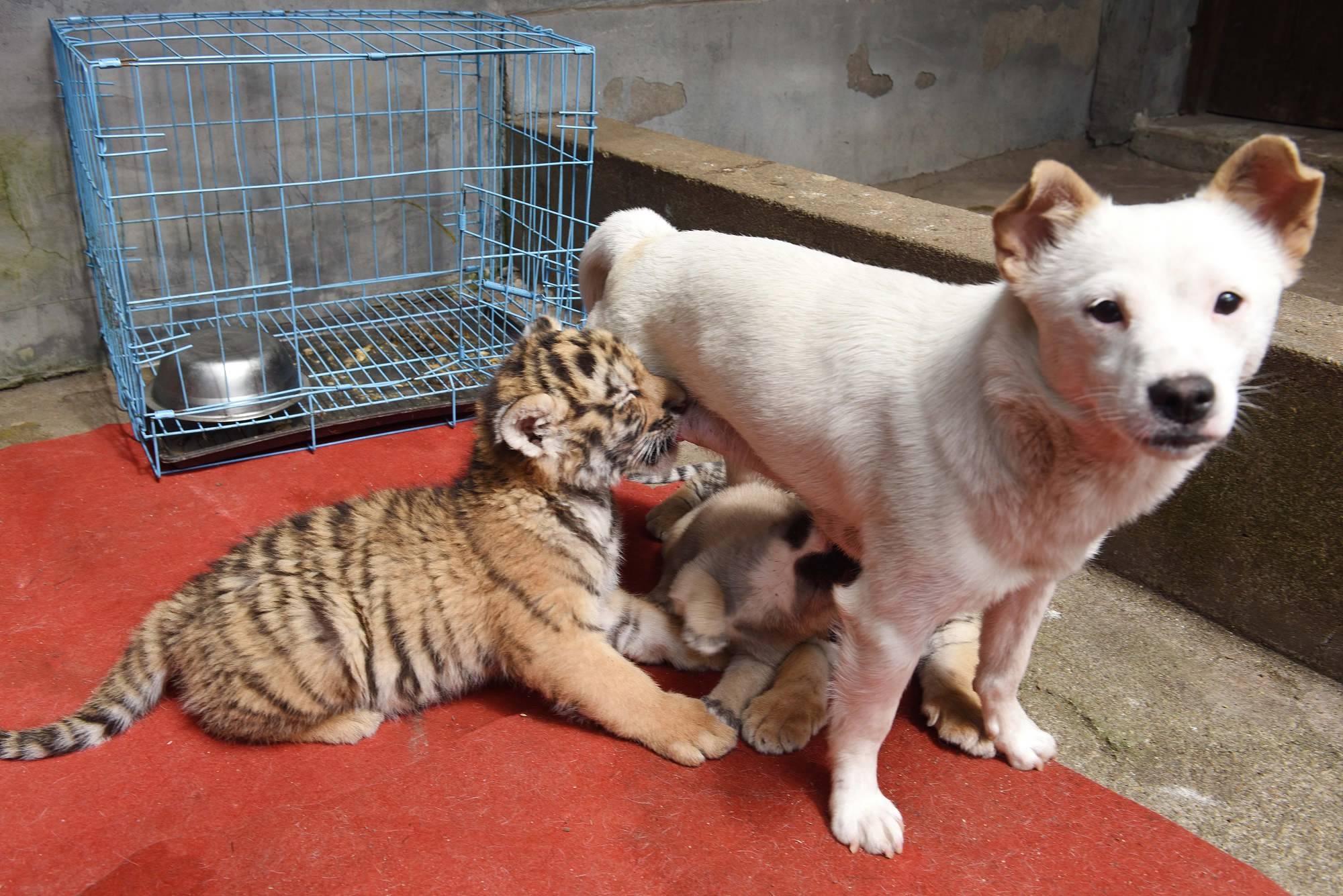 This mother dog now breastfeeds not only her own puppies but also the two little tigers, as dog milk is said to be the best replacement for tiger milk. /VCG Photo