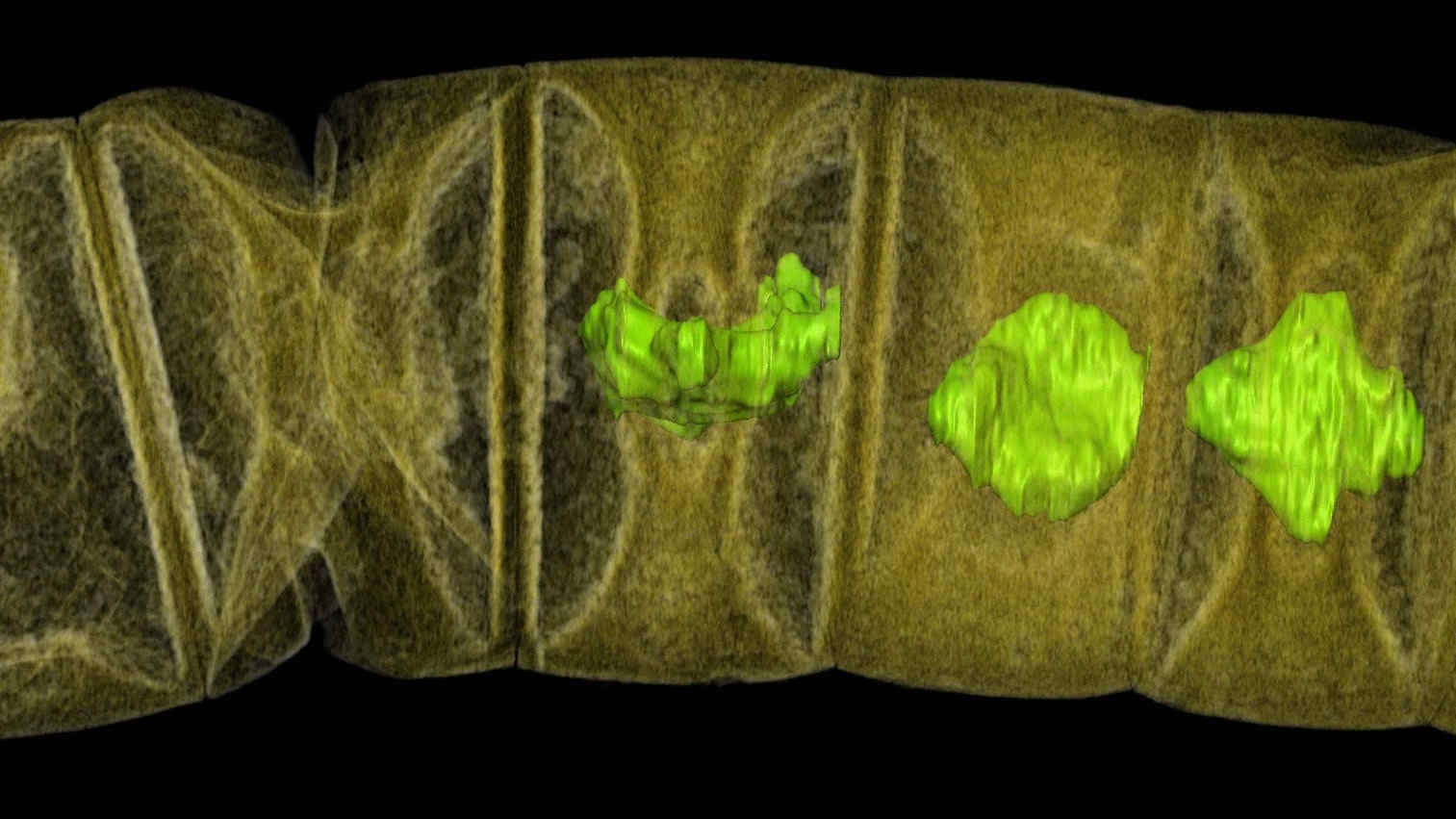 The scientists were also able to see distinct inner cell structures and so-called cell fountains, the bundles of packed and splaying filaments that form the body of the fleshy forms and are characteristic of red algae.