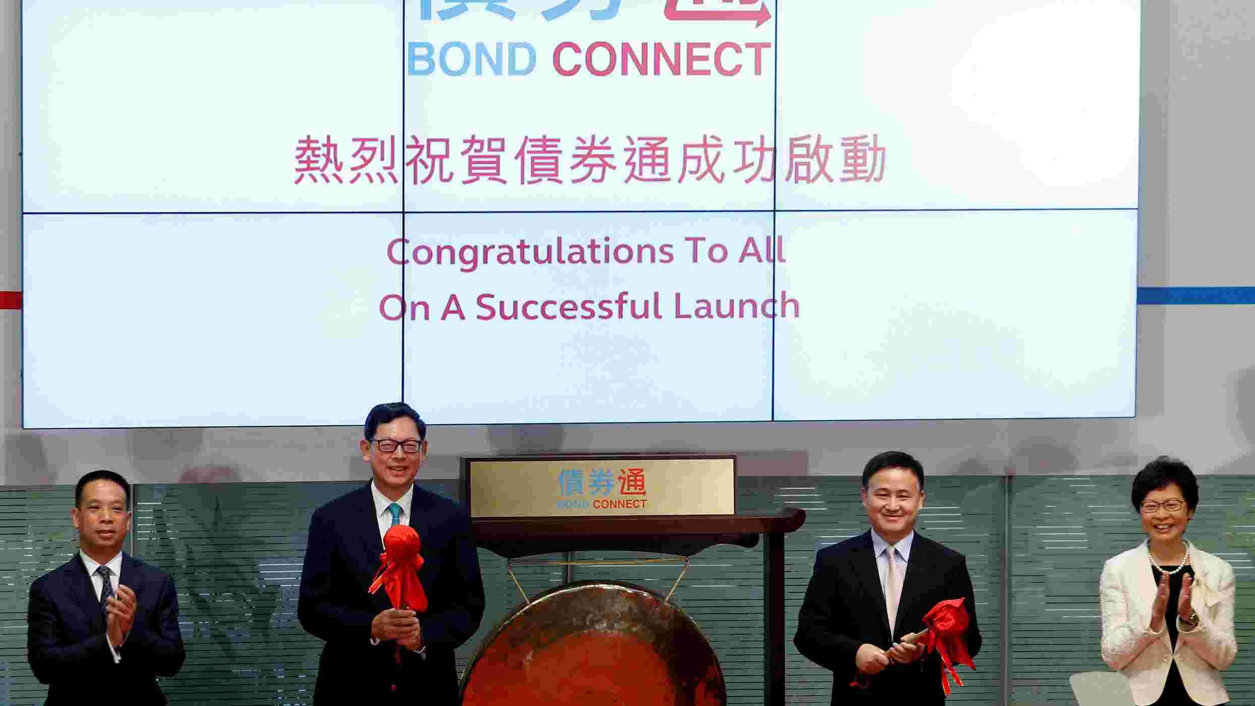 Senior officials from Hong Kong Monetary Authority and People’s Bank of China and Hong Kong Chief Executive Carrie Lam (R), attend the launching ceremony of the Bond Connect at Hong Kong Exchanges on July 3, 2017. /VCG Photo