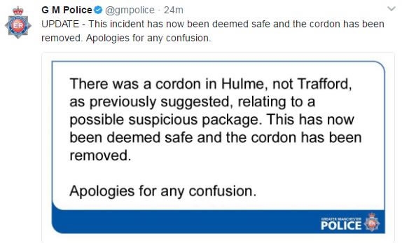 "There was a cordon in Hulme, not Trafford as previously suggested, relating to a possible suspicious package," Greater Manchester Police said in a statement.