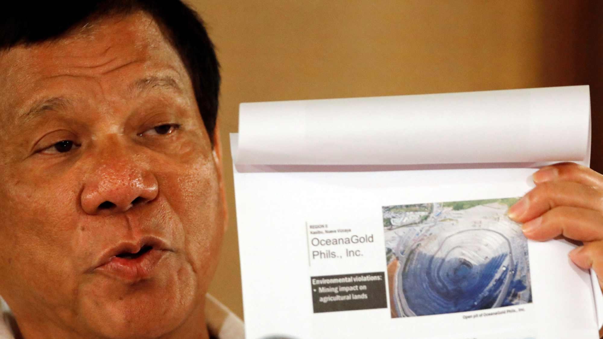 Philippine President Rodrigo Duterte shows pictures of mines during a news conference in Manila, Philippines, March 13, 2017. /CFP Photo