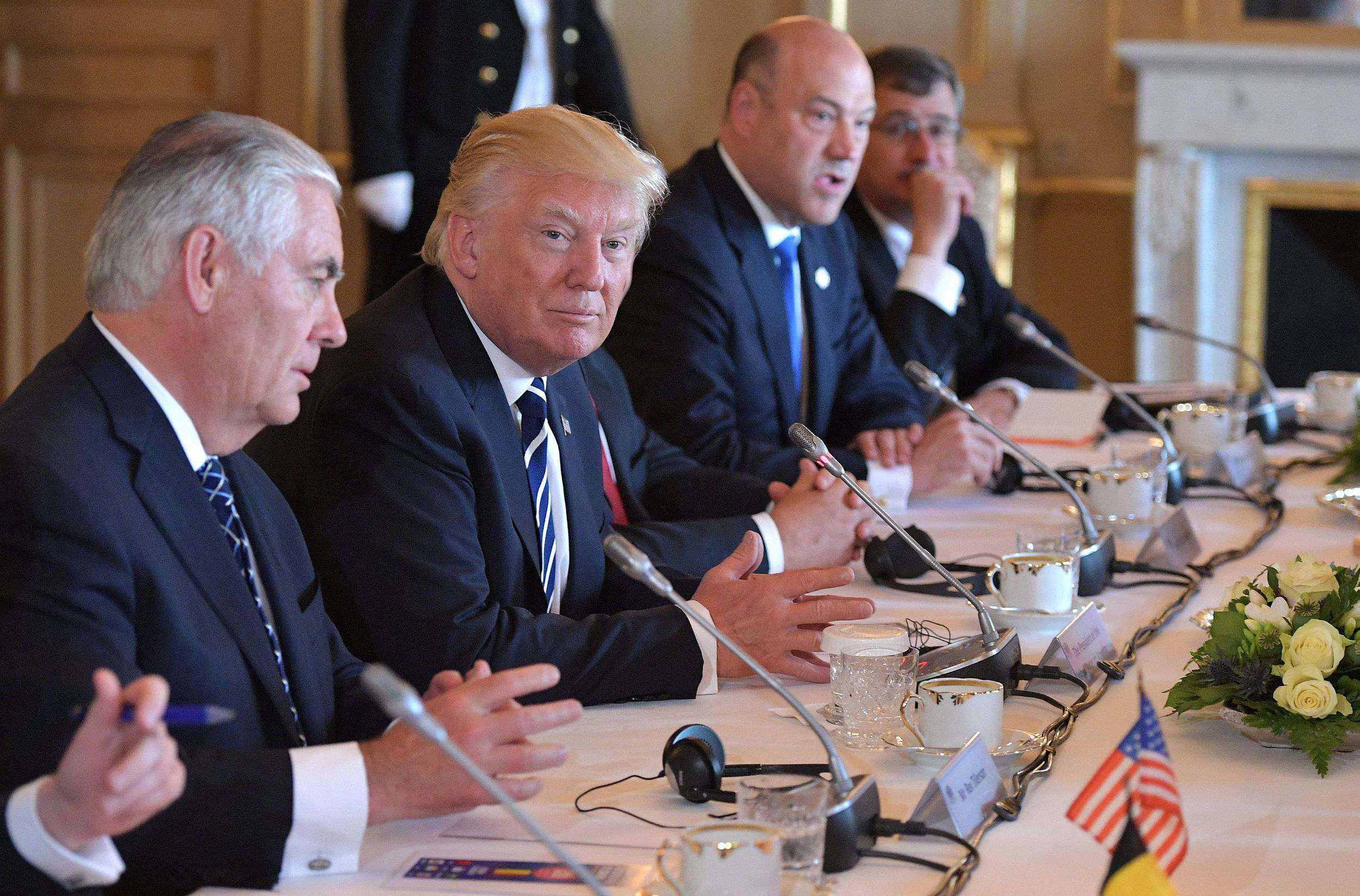 US President Donald Trump (C) takes part in a meeting with US Secretary of State Rex Tillerson (L) and officials on May 24, 2017, in Brussels. /VCG Photo