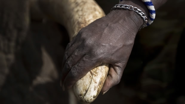 A local Maasai tribesman places his hand on the tusk of a tranquilized wild elephant during an anti-poaching elephant-collaring operation near Kajiado, in southern Kenya, Tuesday, Dec. 3, 2013. / AP Photo