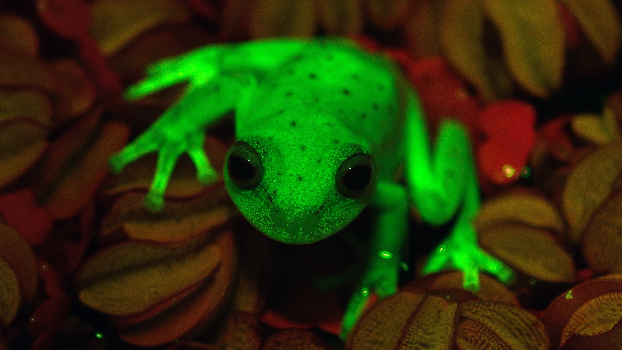 The glowing frog is defined as one of the species of polka-dot tree frogs and lives in South America. According to Nature, a global leading weekly and international scientific journal, the frog displays a mixture of green, yellow and red under normal light, but gives off a blue and green glow under dim light. /VCG Photo