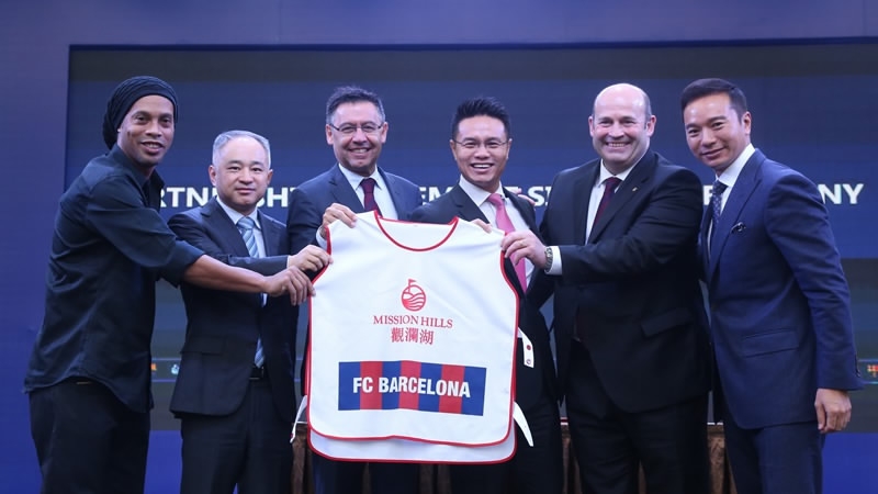 Representatives of Barcelona FC and Mission Hills sign an agreement to launch a Barcelona academy in Haikou, Hainan province in south China on February 24, 2017. /CFP Photo