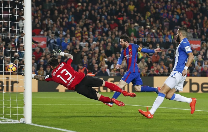 Barcelona's Lionel Messi (C) scores against Leganes in a La Liga match at Camp Nou stadium in Barcelona, Spain on February 19, 2017. /CFP Photo