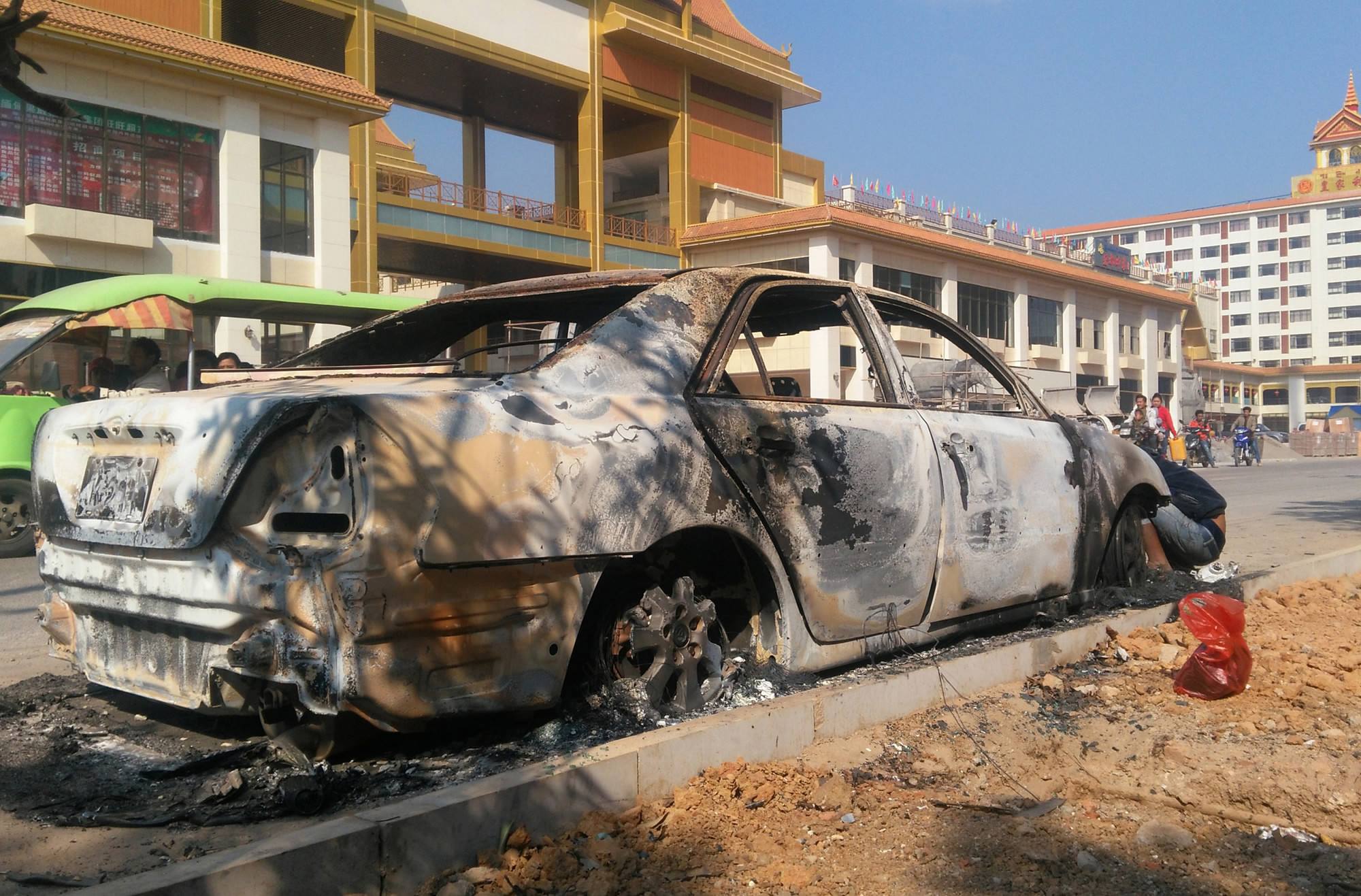 A burnt car is seen in a Laukkai street after the MNDAA's attack on Monday. /CFP Photo