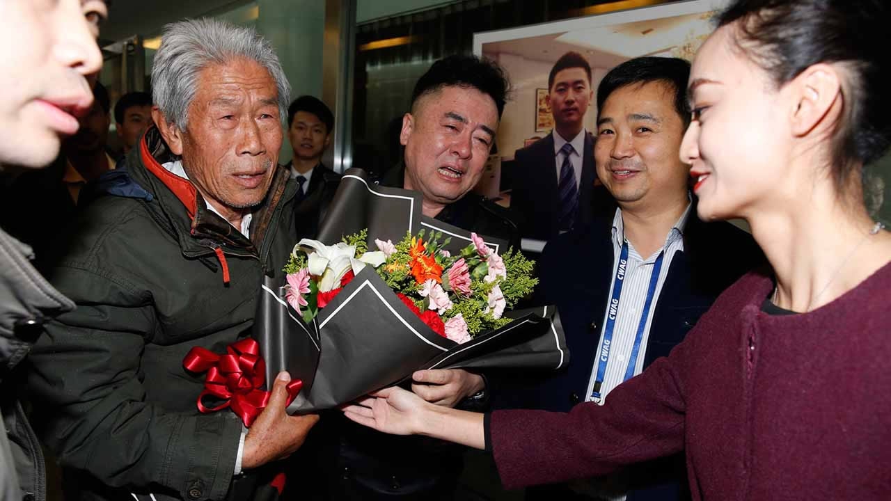 An emotional Wang Qi (L) meets his relatives at Xi'an Xianyang International Airport on February 11, 2017. /CFP Photo