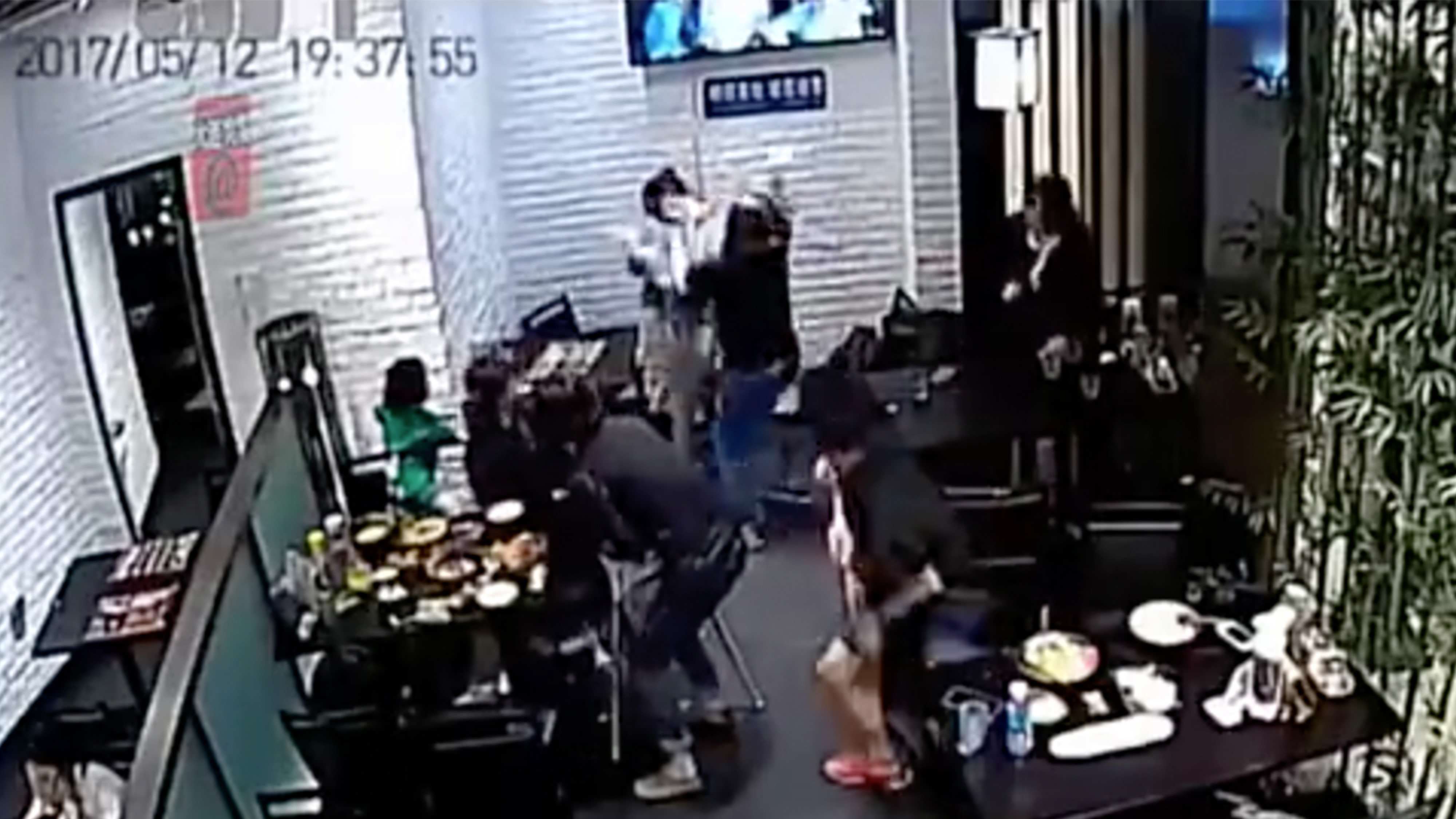Song beat the waiter who tried to stop the fight. /Screen shots of the video footage in a local TV program