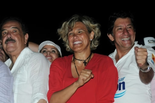 Ecuadorean presidential candidate Cyntia Viteri (C) celebrates with supporters of her Social Cristiano Madera de Guerrero Party during a campaign rally in Guayaquil, on February 16, 2017. /AFP Photo