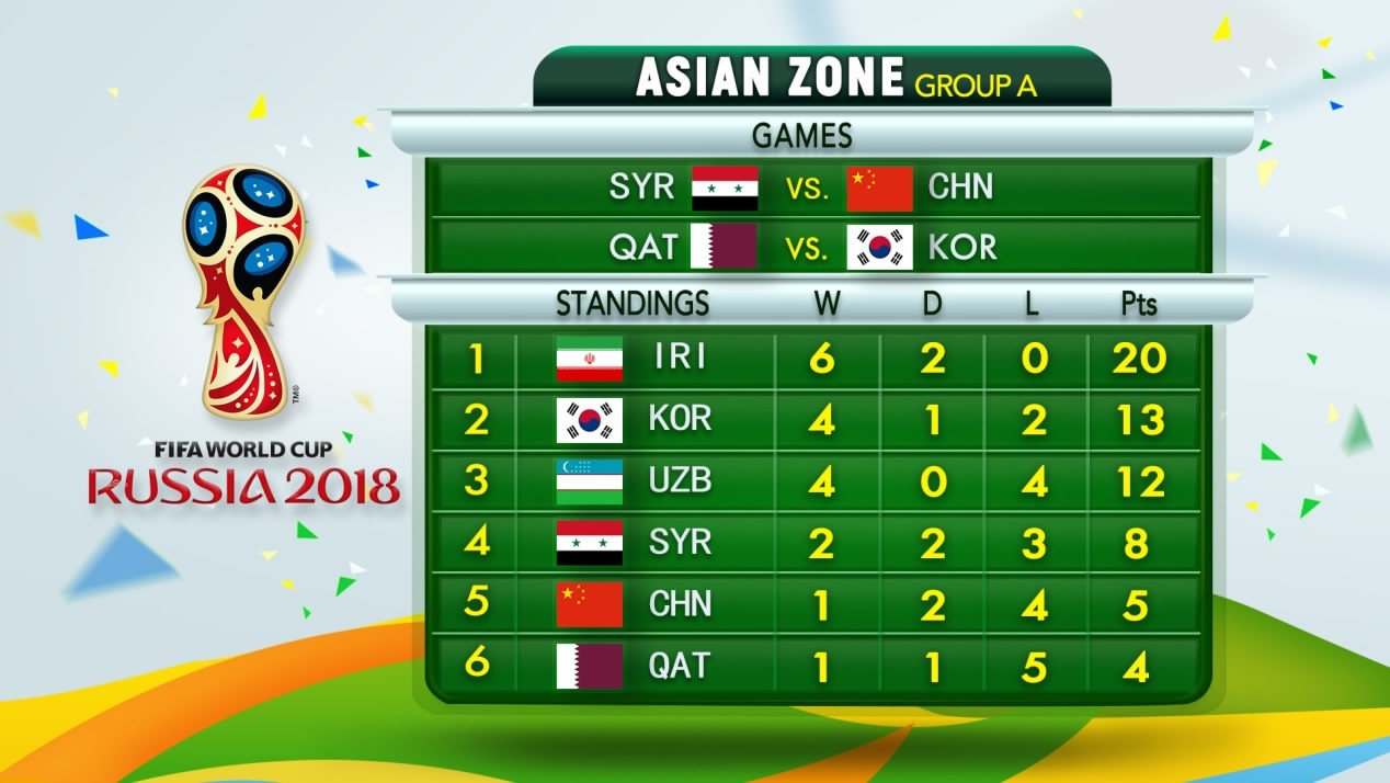 Up to now, Iran top the standings with 20 points and have already qualified. Seven points behind in second place are South Korea, while Uzbekistan are third with 12 points, and on course for the playoff spot. Syria are three points ahead of China, meaning a win for either side is essential to keeping qualification hopes alive.