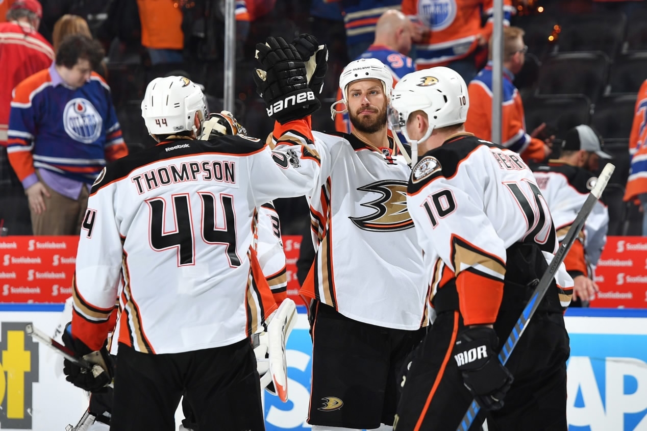 Nate Thompson (left), Ryan Getzlaf (center) and Corey Perry (right) of the Anaheim Ducks celebrate after winning Game Three against the Edmonton Oilers in the NHL playoffs. /CFP photo