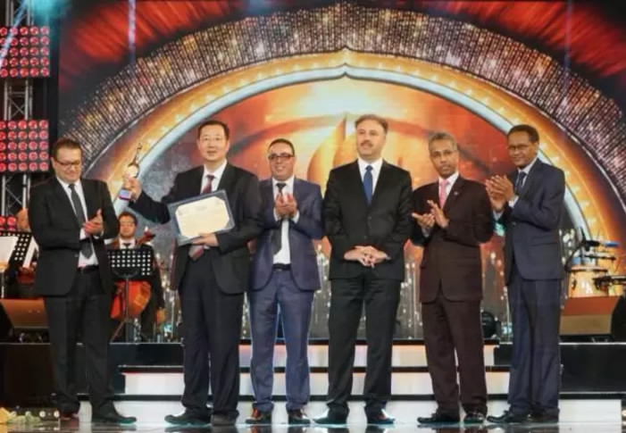 The General Secretary of the Arab States Broadcasting Union Abdelrahim Suleiman (Right 1) presented the awards to the CITVC's Shen Jianing (Right 2) on 28 April, 2017. /CGTN Photo