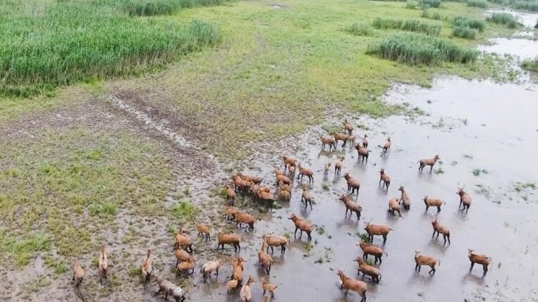 Staff with Hunan Provincial Forestry Department found 62 wild milu deer during a drone inspection in a state nature reserve near Dongting Lake, the second-largest freshwater lake in China. It is the biggest group of wild milu deer ever seen in the area.