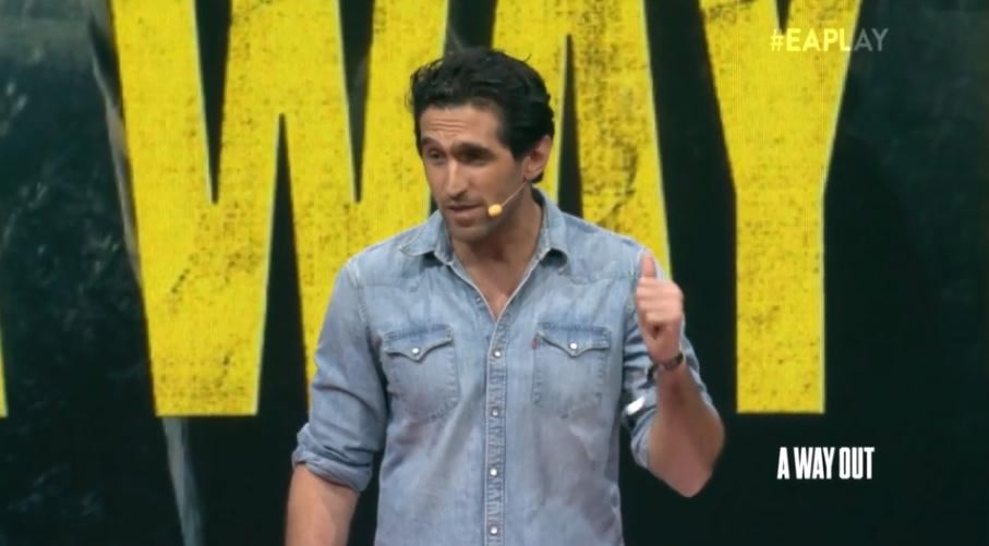 Josef Fares explains his second game A Way Out to a crowd at E3 2017. /EA Screenshot
