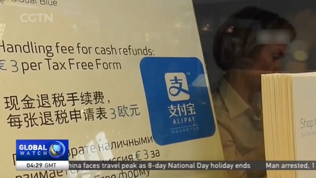 An increasing number of shop-owners in Europe and the Americas are adopting some of China's e-payment platforms to attract Chinese shoppers. Shops with e-payment services have attracted more Chinese customers by sparing them the trouble of carrying large sums of foreign currency. China's Alipay now provides e-payment services to 200-thousand stores in 30 countries and regions, with its major rival WeChat Pay not far behind. Two out of three mobile devices in China have downloaded e-paying applications, with this trend now expanding globally.