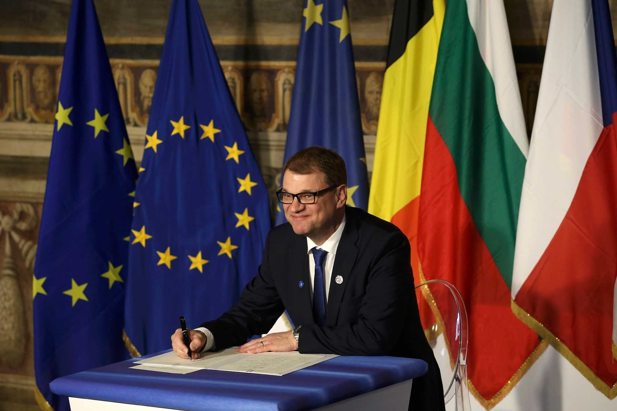Finland's Prime Minister Juha Sipila signs a document during the EU leaders meeting on the 60th anniversary of the Treaty of Rome, in Rome, Italy March 25, 2017. /CFP Photo