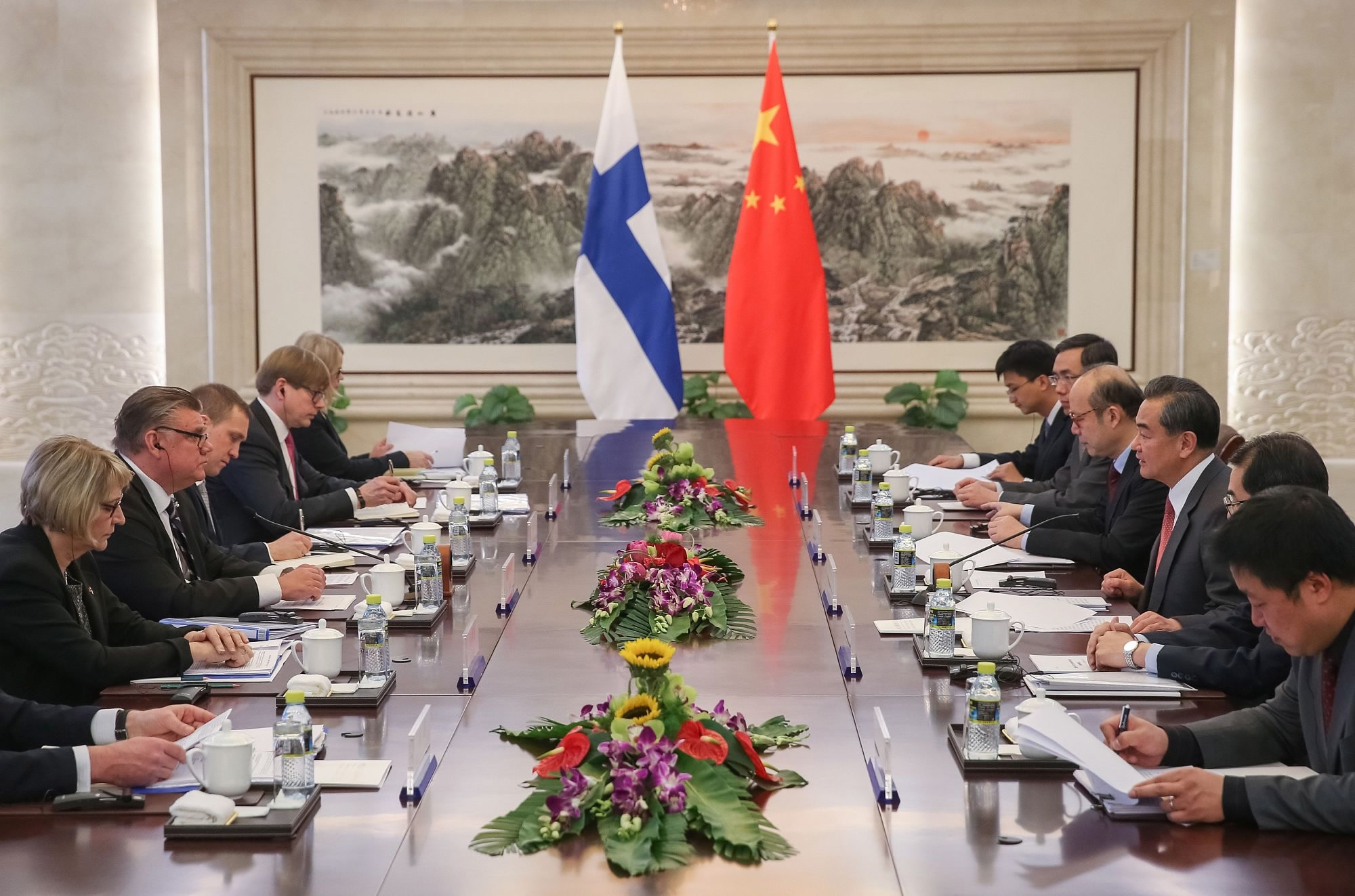 The meeting between Chinese Foreign Minister Wang Yi (3-R) with Finish Foreign Minister Timo Soini (2-L) during their meeting at the Ministry of Foreign Affairs in Beijing on February 27, 2017. / CFP Photo