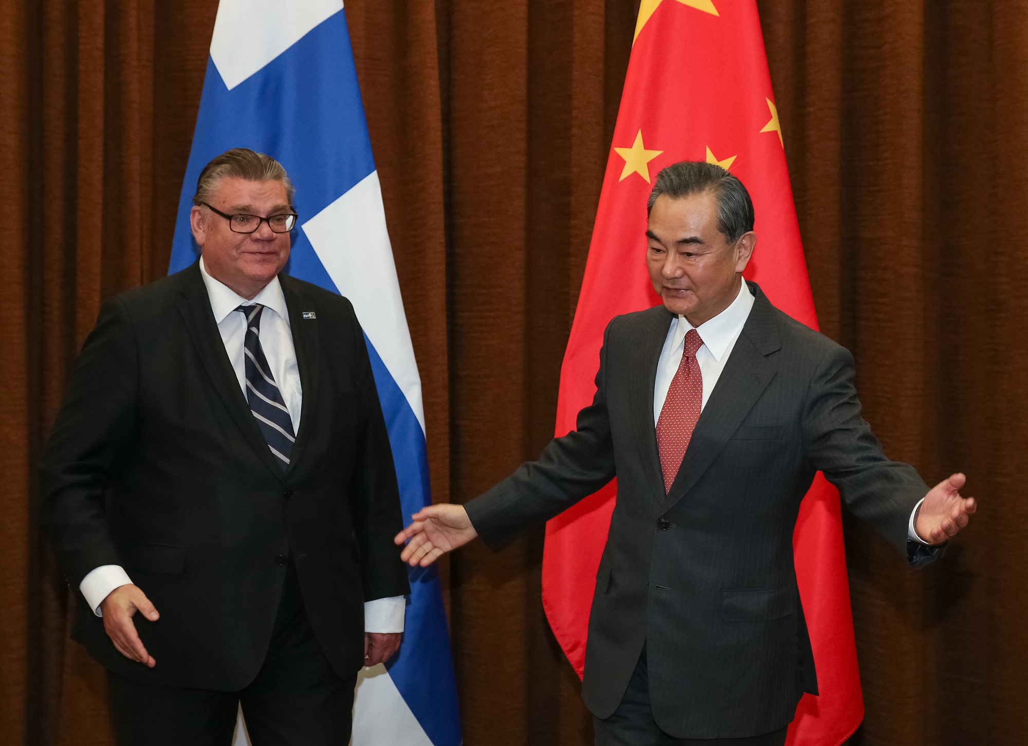 Chinese Foreign Minister Wang Yi (R) gestures to Finish Foreign Minister Timo Soini (L) during their meeting at the Ministry of Foreign Affairs in Beijing on February 27, 2017. / CFP Photo