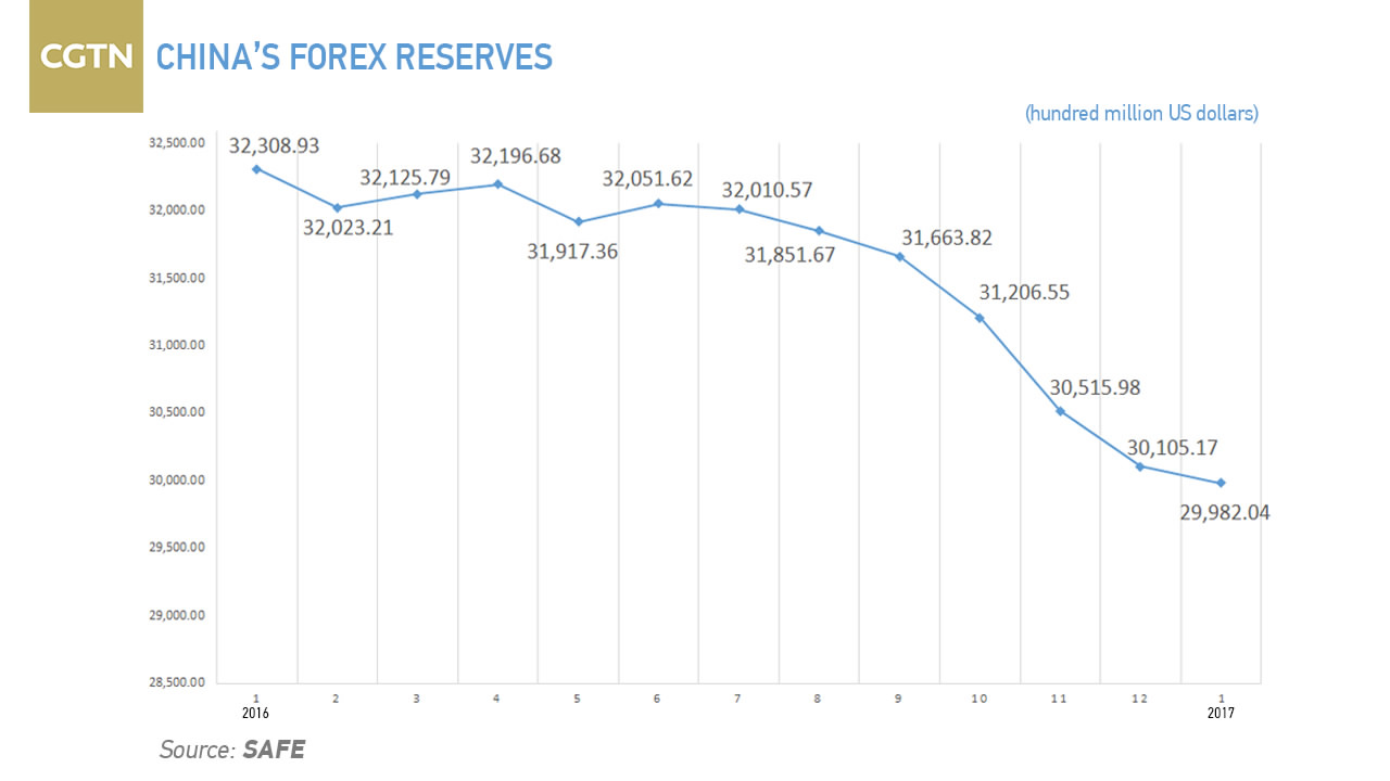 The reserves dropped from 3.01 trillion US dollars in December 2016, according to the State Administration of Foreign Exchange (SAFE).