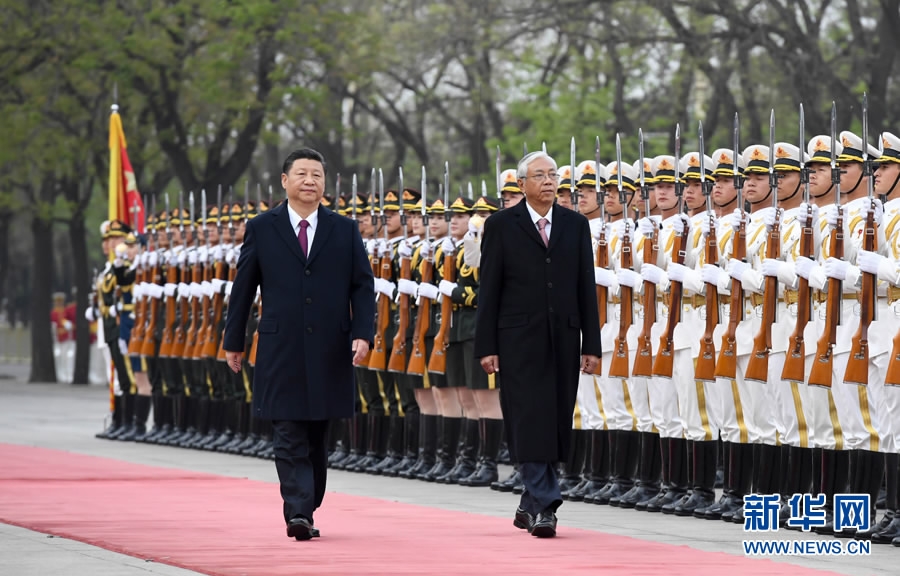 Chinese President Xi Jinping (L) holds a welcome ceremony for Myanmar President U Htin Kyaw before their talks in Beijing, capital of China, April 10, 2017./Xinhua Photo