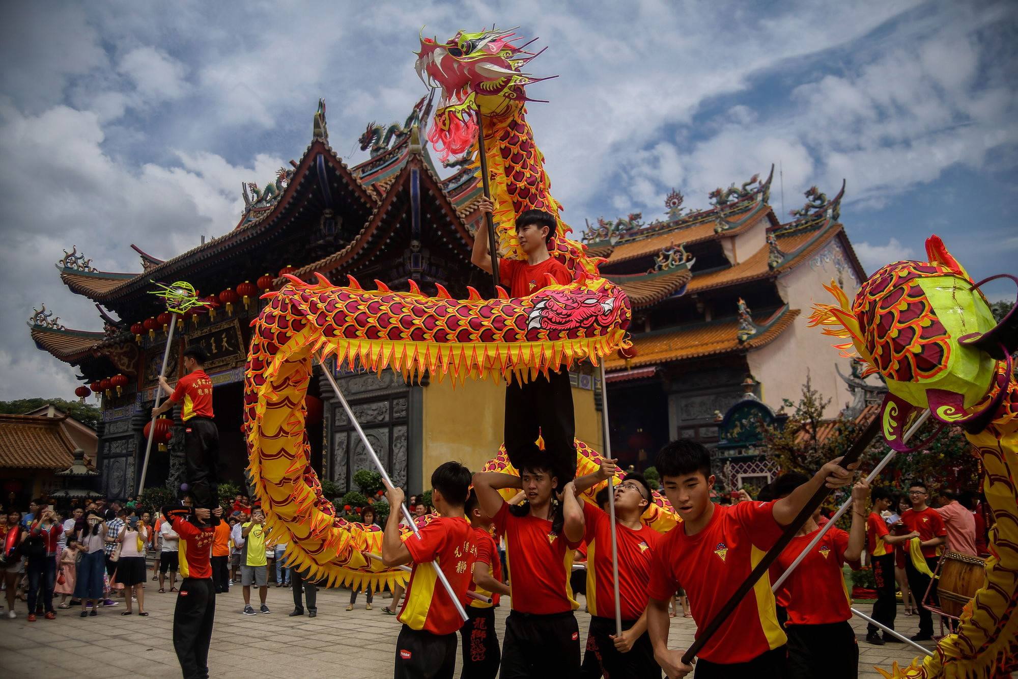Malaysian Chinese perform a dragon dance at a temple during Lunar New Year celebrations outside Kuala Lumpur on January 28, 2017 in Klang, Malaysia. /CFP Photo