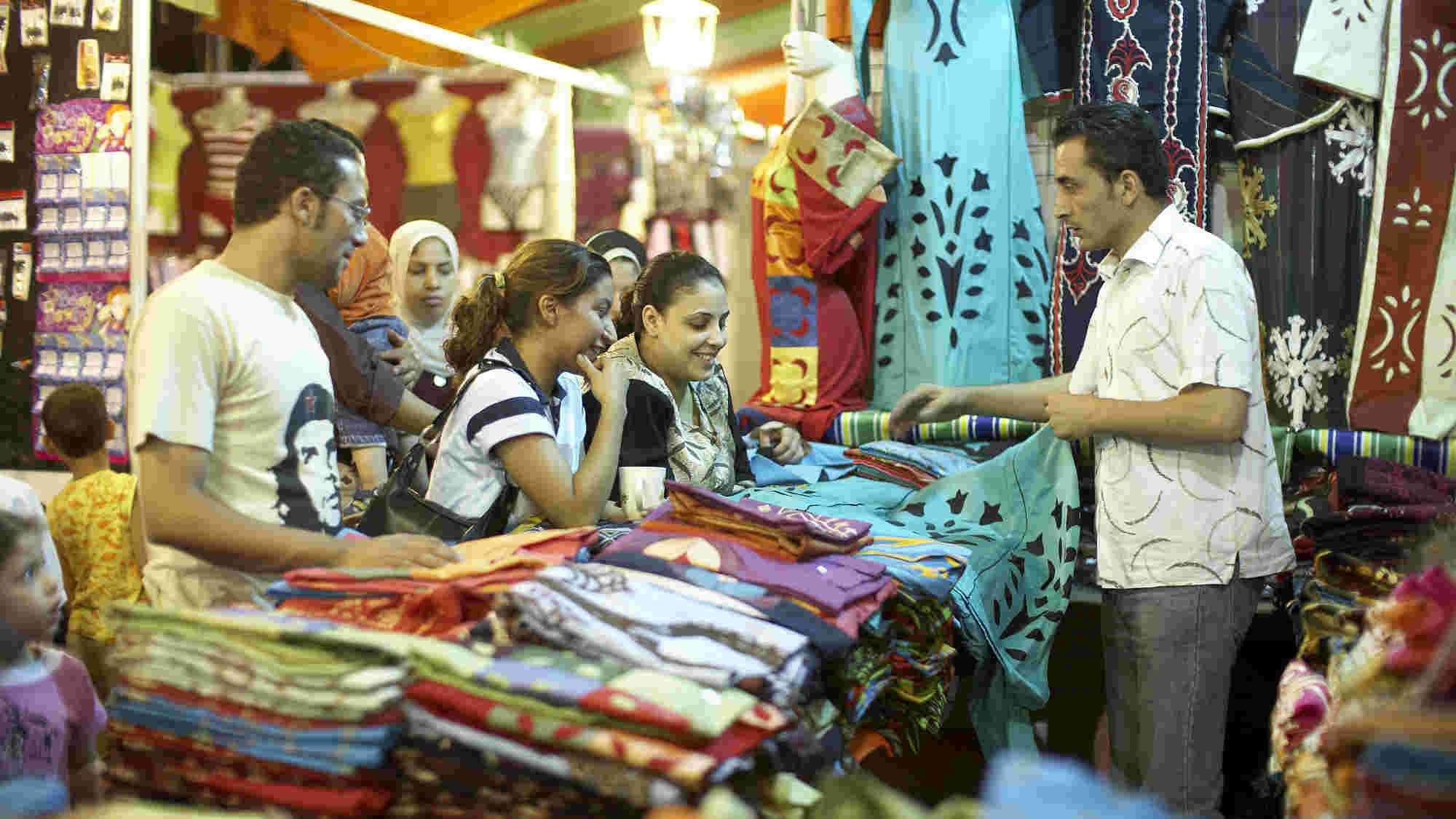 People look at fabrics at a night market in Cairo. /CFP Photo