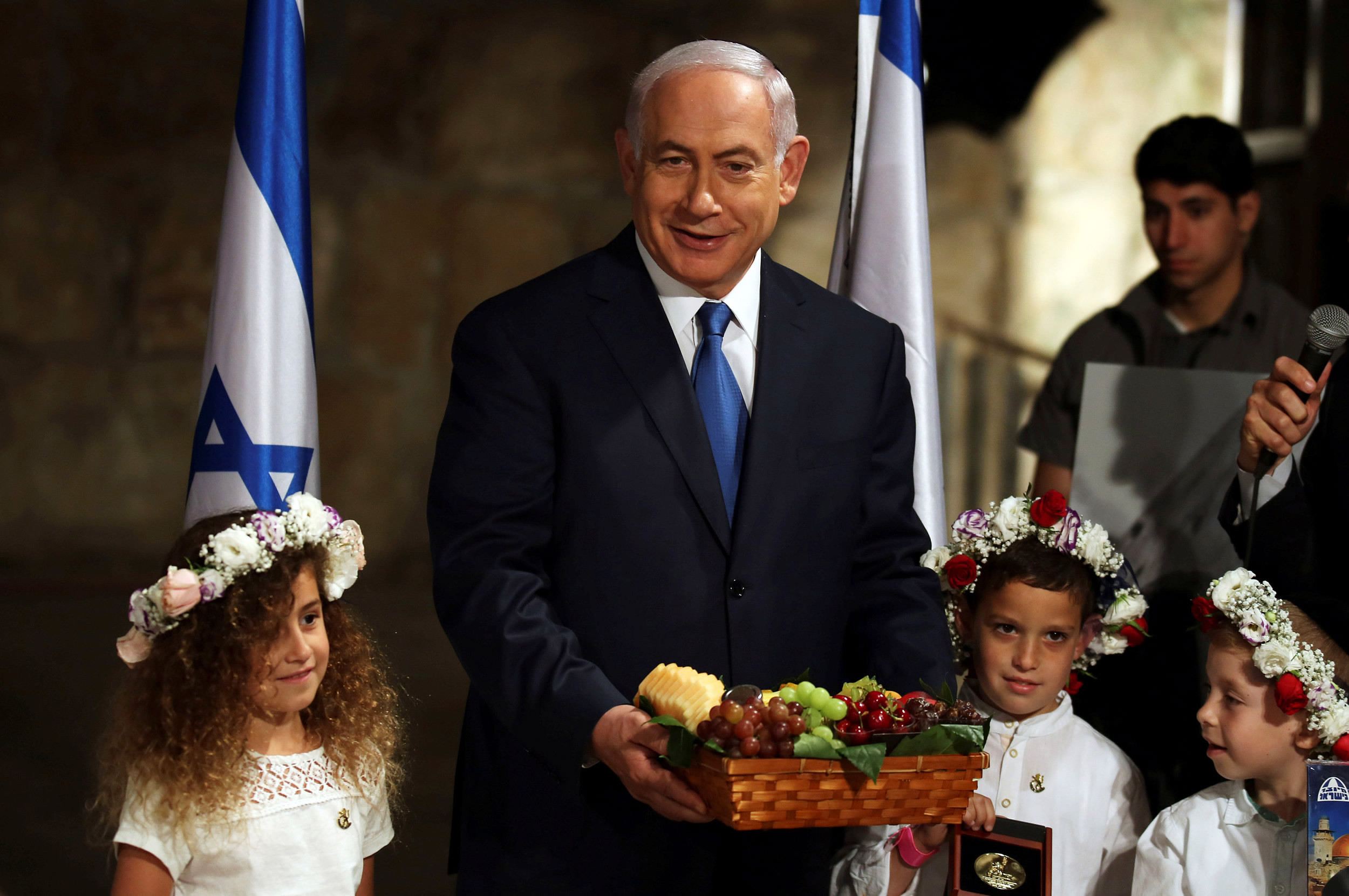 Israeli Prime Minister Benjamin Netanyahu holds a basket of fruit he received from local children, a custom associated with the upcoming Jewish holiday of Shavuot during a special cabinet meeting held in the Western Wall tunnels in Jerusalem's Old City on May 28, 2017. /VCG Photo