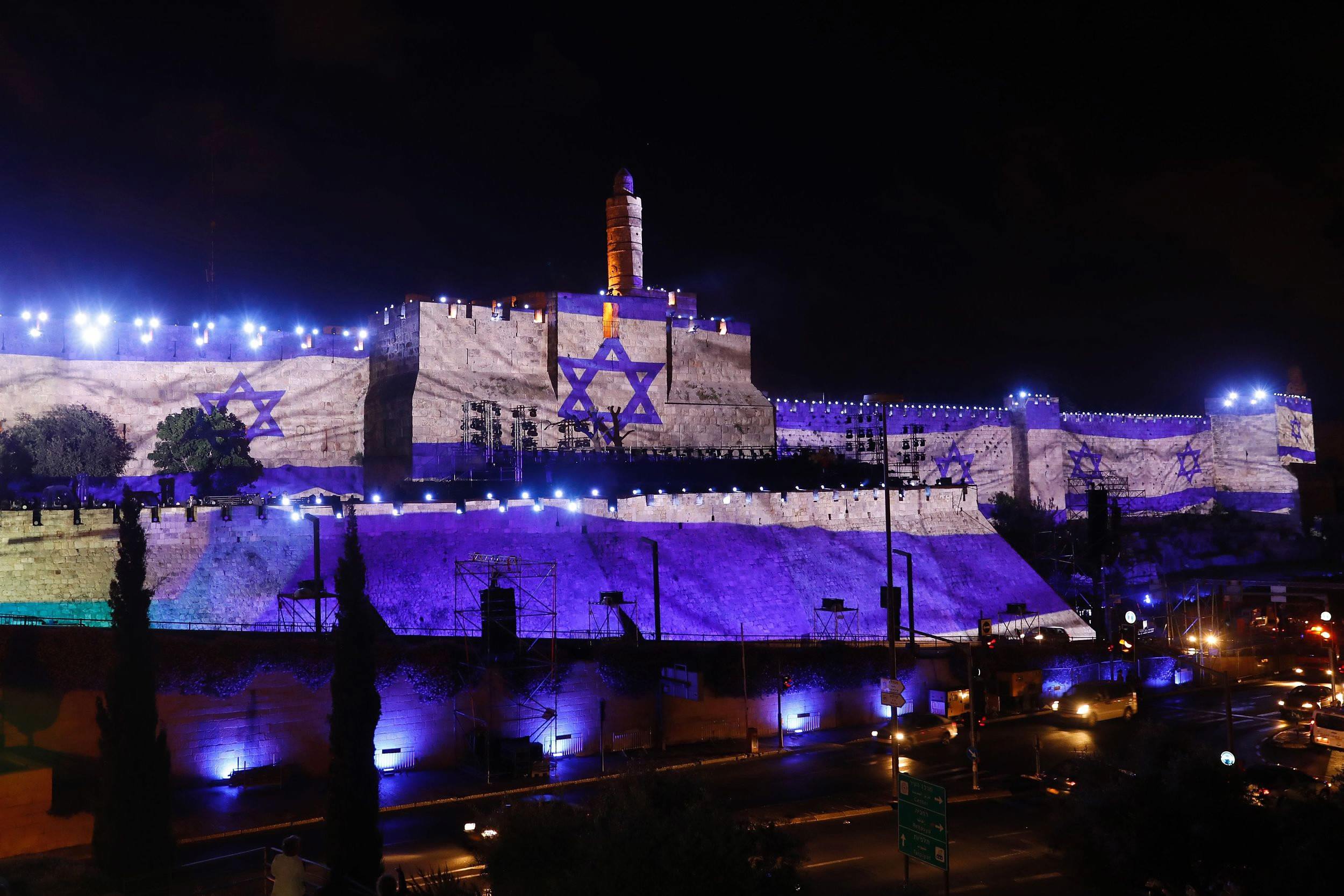 An audio slideshow is projected on the ancient walls of Jerusalem's Old City on May 20, 2017, at the beginning of the week marking the 50th anniversary of the 1967 Israeli-Arab War. /VCG Photo