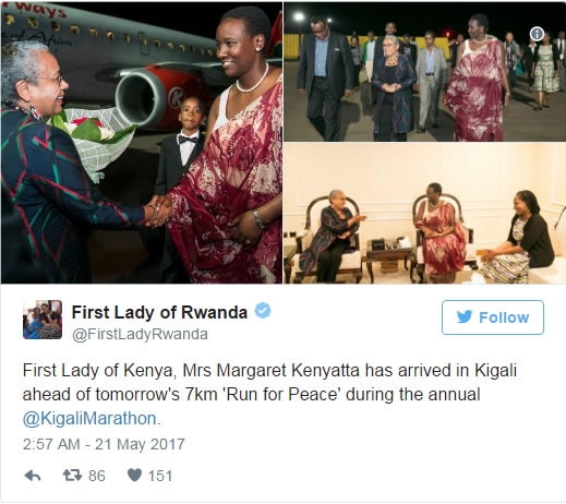 Kenyan first lady Margaret Kenyatta will join Rwandan first lady Jeannette Kagame on a seven kilometer track for a run to raise awareness for peace. The non-competitive lap is part of the 13th edition of the Kigali International Peace Marathon in Rwanda.