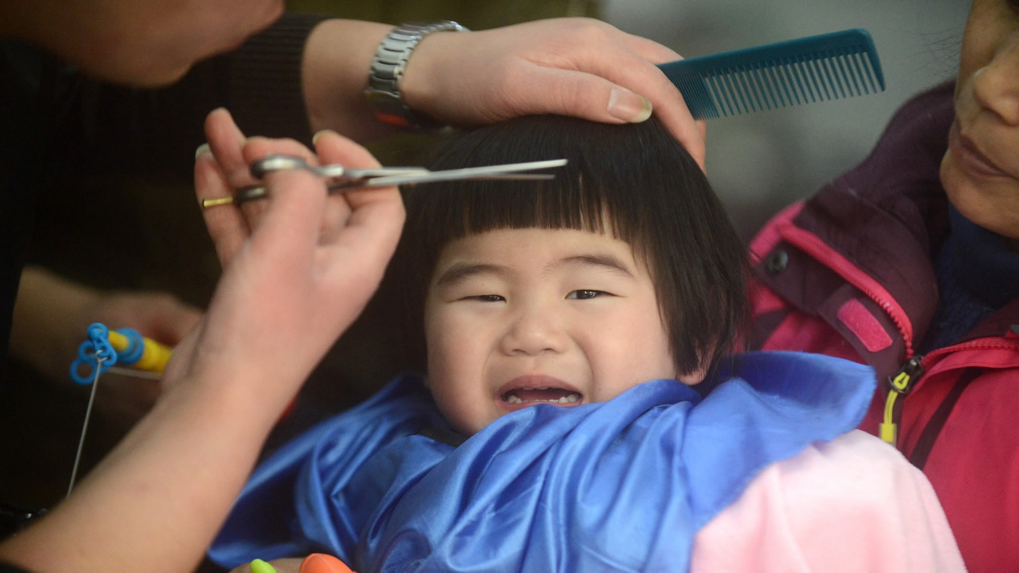 A little girl has her hair cut at a barbershop in Yangzhou City, Jiangsu Province on February 27, 2017. /CFP Photo