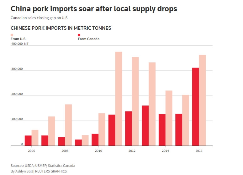 In the first quarter of 2017, Canada shipped nearly 93,000 tons of pork to China, on pace to hit 372,000 tons annually. That eclipsed the 87,500 tonnes that the United States shipped, according to data from both governments.