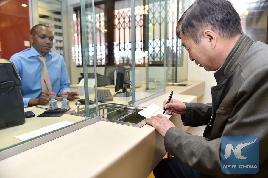 A Chinese client fills forms at the new branch of National Bank of Kenya which will host a clearing house for Chinese renminbi (RMB) in Nairobi, Kenya. /Xinhua Photo