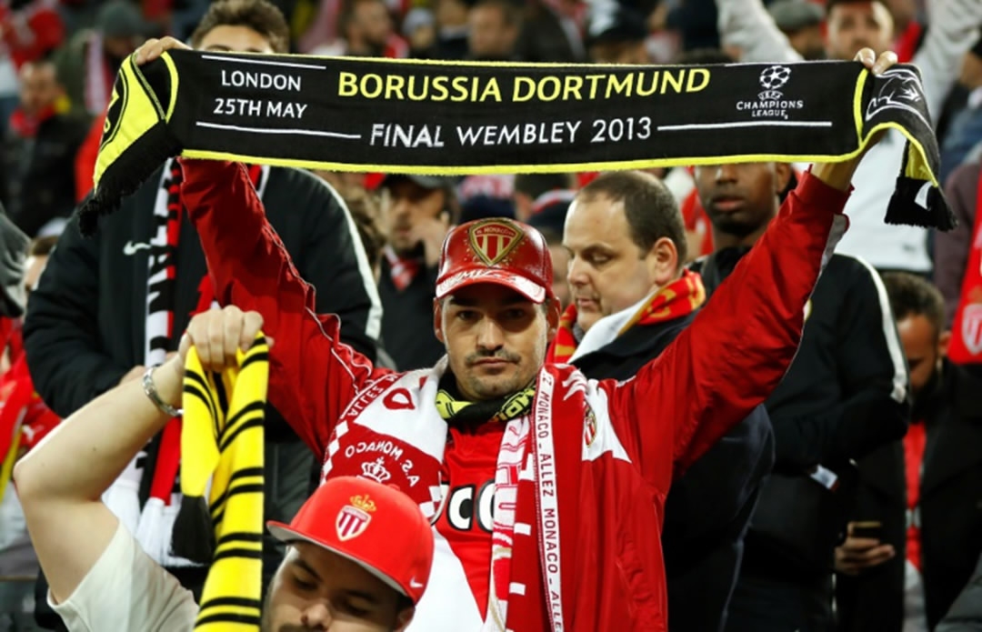 Monaco supporters with Borussia scarves react in the stadium after the match was postponed amid an explosion near the bus of Borussia Dortmund prior to the UEFA Champions League 1st leg quarter-final football match on April 11, 2017. /AFP Photo