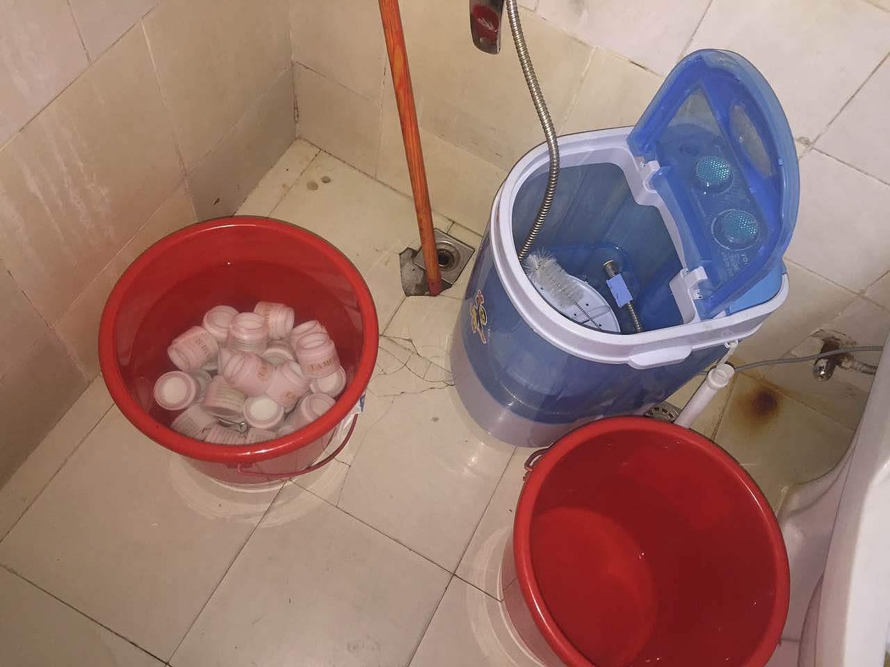 Fake cosmetics bottles ready for washing in an apartment shower. /VCG Photo