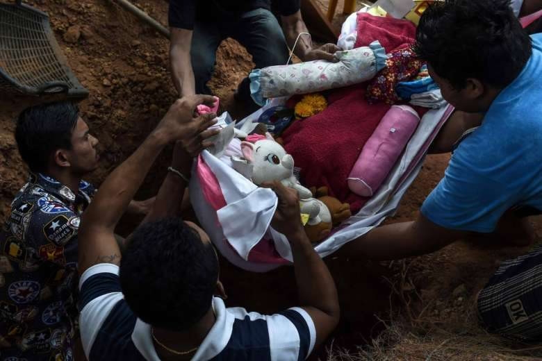 The body of 11-month-old girl Natalie is carried into her grave by male relatives in Phuket on April 29, 2017. / AFP Photo