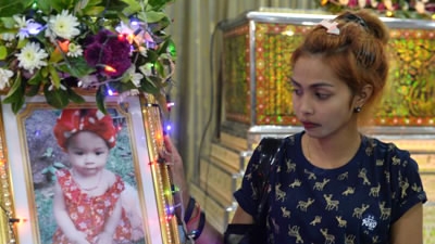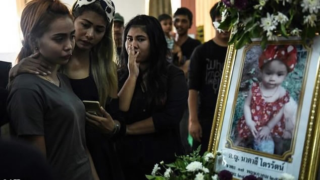 On Saturday relatives held Natalie's sobbing mother as Buddhist monks chanted around a freshly-dug grave for the infant, who was pictured in a framed photo wearing a red dress.