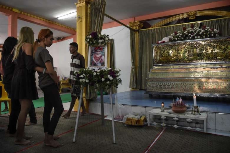 Jiranuch Trirat (3rd from left) is comforted by friends as she looks at a photograph of her daughter during the last funeral rites at a temple in Phuket on April 29, 2017. / AFP Photo